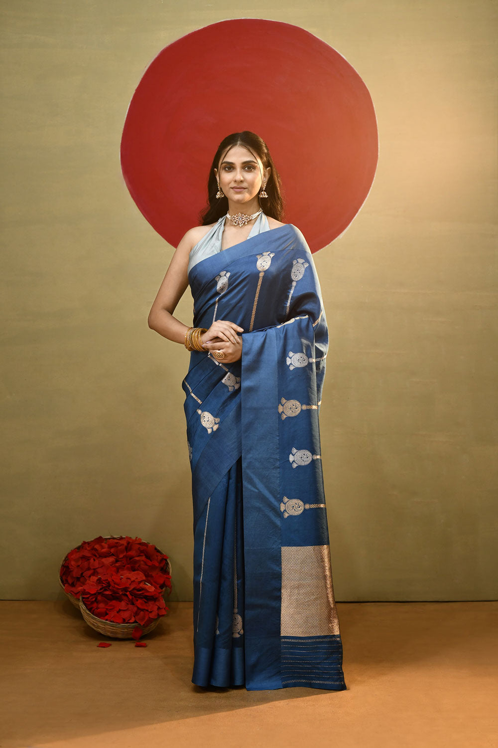 A radiant display of traditional elegance - this stunning blue Banarasi handloom saree is a radiant display of traditional elegance. Crafted from the finest Katan silk, it features alternating stripe motifs in both gold and silver zari, creating a mesmerizing interplay of light and texture. The unique patterns, woven across the body, exude sophistication and add a contemporary touch to the classic Banarasi weave. The luxurious pallu, adorned with intricate zari work, further enhances its grandeur. This saree, with its rich blue color and the harmonious blend of gold and silver, brings a balance between tradition and modern grace.